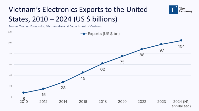 Measuring educational readiness for export-led growth rarely enjoys the precision of customs data, but triangulated indicators reveal a story both sobering and actionable. Vietnam’s electronics exports to the United States touched US$97 billion in 2023, a twelve-fold increase since 2010.