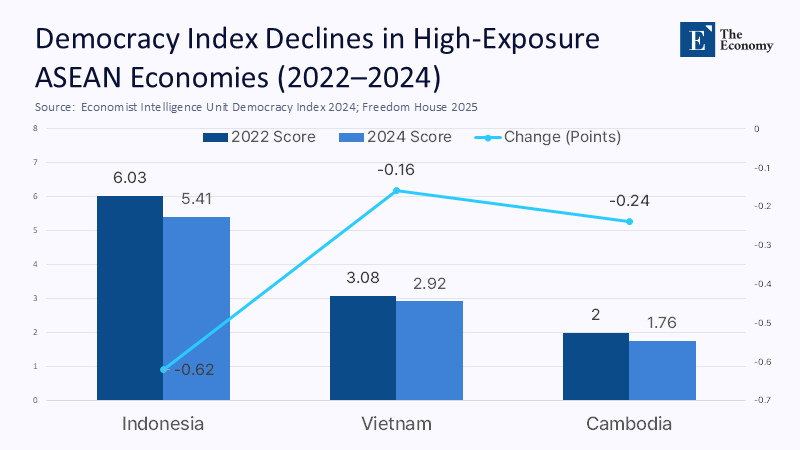 Economic compression alone does not doom democratic progress, but it lowers the tolerance for messy bargaining that democratisation requires. The Economist Intelligence Unit’s 2024 index registers a regional score drop from 5.41 to 5.31—the sixth consecutive annual decline.⁷ Freedom House now lists Indonesia at 56 / 100, down one point year‑on‑year, labelling it “Partly Free” with special concern over budget‑driven cuts to electoral oversight. Correlating those scores with my tariff-impact model yields a telling pattern: countries facing the steepest export exposure (Vietnam, Indonesia, Cambodia) are also those that have lost two or more points on the democracy index since 2022.