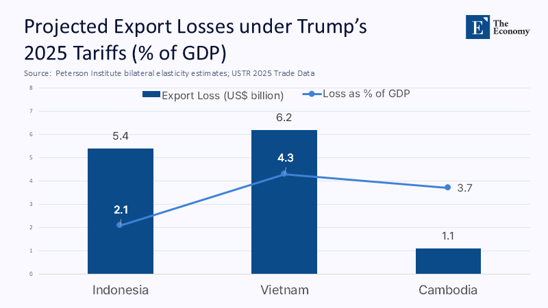 To quantify the economic aspects of the loop, I developed a partial-equilibrium model using 2024 US Census import data and bilateral elasticity estimates from the Peterson Institute. The model assumes a price elasticity of −1.1 for labour‑intensive manufactures and −0.7 for resource commodities. Applying the newly announced 19% tariff to Indonesia and the existing 20% rate to Vietnam, the simulation predicts a first-year export decline of US$5.4 billion for Indonesia and US$6.2 billion for Vietnam, roughly 2.1% and 4.3% of their respective 2024 GDP.