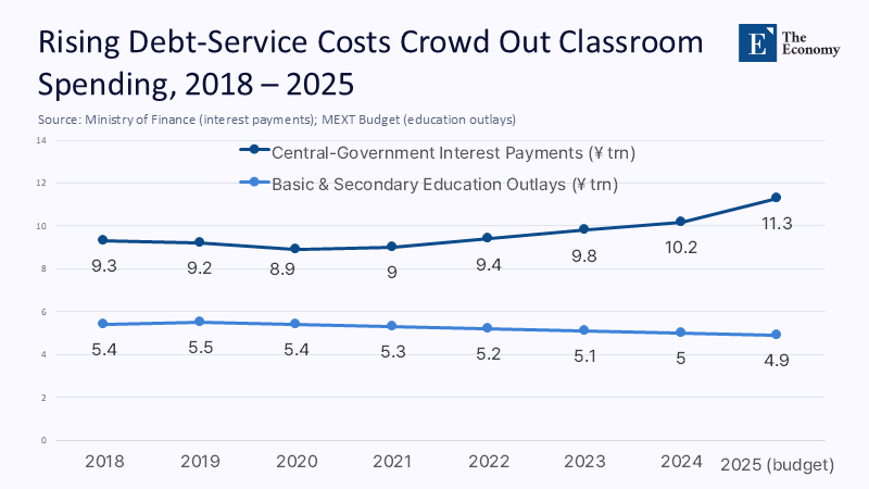 Every yen diverted to interest payments is a yen not spent on classrooms, laboratories, or digital‑learning infrastructure. Education’s share of discretionary spending has dropped to 9.2%, its lowest level in a decade. Extrapolating Finance Ministry tables suggests that if interest costs follow the baseline path, the cumulative shortfall for primary and secondary schooling could reach ¥1.8 trillion by fiscal 2028 — enough to pay 45,000 new teachers for five years. More immediately, prefectural boards have postponed textbook revisions and frozen ICT upgrades, thereby widening the urban-rural achievement gaps.
