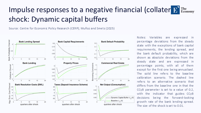 “Won’t this suppress lending when growth is already soft?” The model-based and empirical records now suggest that building releasable buffers when banks have headroom does not reduce short-term lending, but rather tends to increase it at longer horizons by lowering the odds of a credit crunch. That view is embedded in the ECB/ESRB guidance and reinforced by the Bank of England. Moreover, the PRB is state‑contingent: retention switches off as margins normalise and switches to release when risk indicators ease.