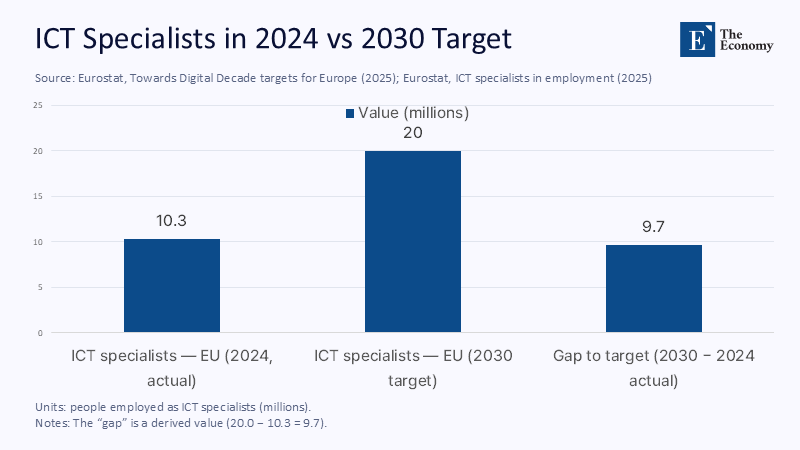 Eurostat. (2024–2025). ICT specialists in employment; Towards Digital Decade targets; Blue Cards 2023; Rising share of ICT specialists.