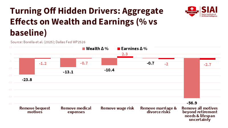 The latest research presents two pertinent claims for education policy. First, the motives we learned about in theory are not just empty concepts; they show up as significant in the data. In a 2025 working paper and related presentations, Borella, De Nardi, Yang, and Torres Chain analyze a comprehensive life-cycle model based on US data and conduct counterfactuals. When they remove bequest motives, total wealth drops by 23.8% and total earnings decrease by 1.2%. When they remove the risk of medical expenses, wealth falls 13.1% and earnings decline 0.7%. When they remove wage risk, wealth drops 10.4%, but earnings increase by 2.3% because more stable wages lead people to save less and change their work patterns. Turning off marriage and divorce dynamics produces varying effects by group, but roughly balances out as a whole. These are hidden drivers that help explain how people save and work at different ages and in various family situations. This evidence sheds light on the real-world implications of these hidden motives, offering a deeper understanding of economic behavior.
