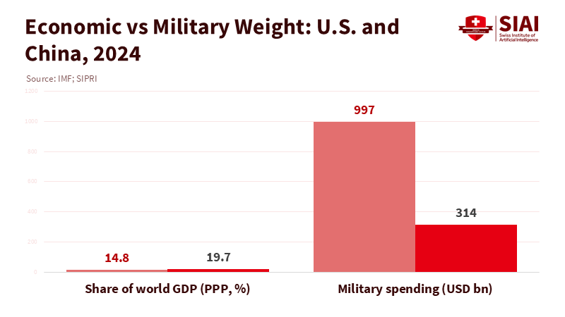 Let's start with capabilities. In output, China has moved ahead in PPP share, while the U.S. still leads in defense and many cutting-edge technologies. Global military spending reached a record $2.72 trillion in 2024; the U.S. accounted for 37%, with spending 3.2 times that of China. However, the gap in research is narrowing. The NSF's 2025 indicators estimate that in 2022, the U.S. contributed about 30% of global R&D and China about 27%. Newer NSF reports show U.S. R&D rising to roughly $940 billion in 2023, while China's growth rate continues to surpass that. In the AI sector, the 2025 Stanford AI Index reveals U.S. private AI investment exceeding $100 billion and ongoing U.S. leadership in top models, even as Chinese systems close performance gaps. Taken together, these measures indicate a gradual rebalancing: partial economic parity, enduring defense asymmetry, and a research competition with diminishing gaps—precisely the characteristics of a long slope, not a sudden turn. Note: PPP indicates economic weight, SIPRI reports are in constant dollars, and NSF applies PPP adjustments for international R&D comparisons.