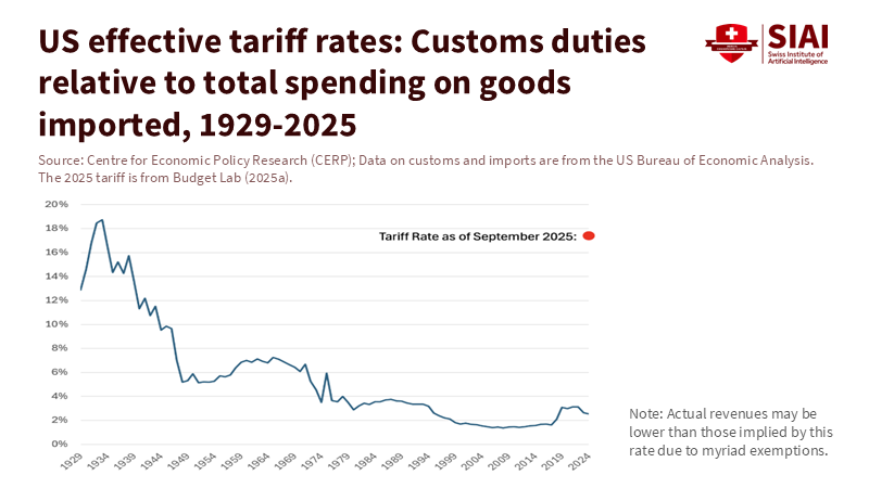 One figure gets lost in all the noise: 2.2%. That was the U.S. trade-weighted average tariff in 2024. It isn't 100%. It isn't even in the teens. It's a low single digit that looks like business as usual at first glance. The average hides significant spikes on a small selection of products and partners. It also obscures how "targeted US tariffs" function today—sharp, visible changes on politically important items paired with exemptions and pauses that soften the impact—resulting in revenue increases, but not in a straight line. Prices rise, but not universally. The overall tariff level remains closer to the past two decades' policy baseline than it does to the 1930s. To understand what lies ahead for budgets, prices, and classrooms, we need to start with that base rate and identify the narrow areas where policy influence is real.
