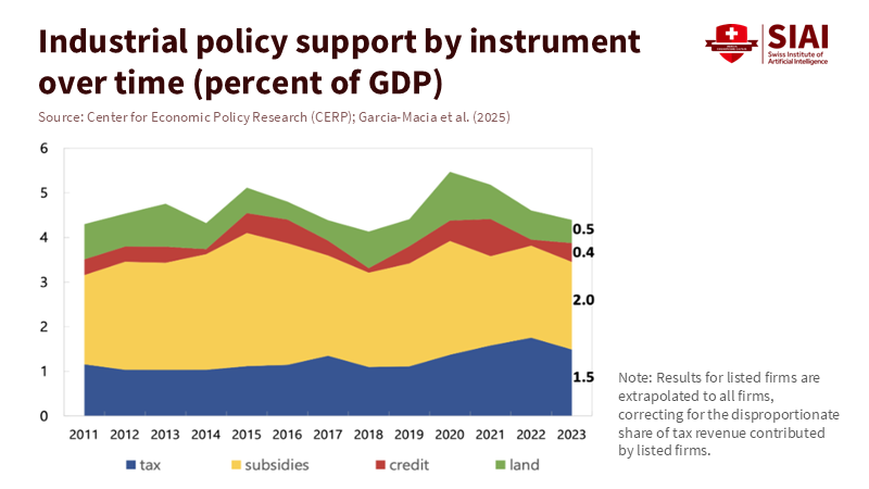The most precise starting point is within China. The latest measurement shows that industrial policy support—comprising cash subsidies, effective tax relief, cheaper loans, and discounted land—adds up to about 4% of GDP in 2023. These measures direct resources toward specific sectors and away from more productive uses. In an ideal model, resources would shift until returns are equal. However, in China's second-best reality, policy distortions keep labor and capital in less efficient areas, reducing overall productivity by about 1.2%. Over time, this can reduce GDP by up to 2% compared to a hypothetical situation without such policies. These figures are based on firm accounts, land registries, and effective tax rates over a decade. Therefore, the domestic efficiency loss is the first entry in any calculation of global welfare loss from Chinese subsidies.