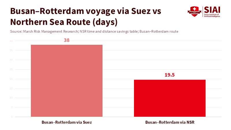 The Northern Sea Route, which runs along Russia’s Arctic coast, can reduce the sailing distance between Northeast Asia and Northern Europe by 20-40% compared to the Suez Canal, depending on the ports involved. On specific routes between Japan and Europe, a journey that takes more than three weeks via the Suez Canal can, under favorable conditions, drop to roughly ten days through the Arctic. This difference results in lower fuel costs, fewer crew days, and less exposure to chokepoints such as the Red Sea and the Strait of Malacca. As climate change reduces summer sea ice and Russia invests in icebreakers, ports, and satellite navigation, this route has transitioned from an experimental idea to a practical corridor. For a Eurasian power constrained by sanctions and seeking new advantages, Arctic geography is a strategic asset.