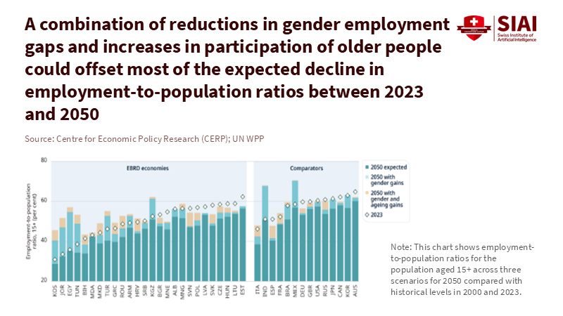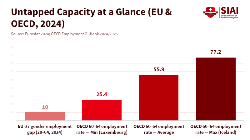 In 2024, the European Union still had a gender employment gap of 10 percentage points. About 80.8% of men aged 20 to 64 were employed, compared to 70.8% of women. Across the OECD, employment among people aged 60 to 64 averaged 55.9%, ranging from 77.2% in Iceland to 25.4% in Luxembourg. These two facts highlight a key truth: the fastest way to counterbalance demographic decline is to increase employment among women and older workers. Lagging countries have a significant opportunity for growth; those that already perform well see smaller gains. New research from CEPR shows that closing gender gaps and increasing employment for those over 60 could offset most of the expected decline in employment-to-population ratios caused by ageing. This isn't a distant issue. It's a set of immediate choices about childcare, taxes, training for older adults, and pension policies that can either turn untapped potential into jobs or let it go to waste as the population ages.