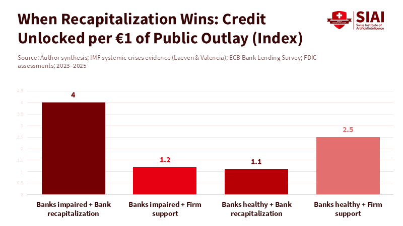 The important thing to save is whatever is blocking the flow of money. If banks are doing okay but don’t have enough money, every dollar the government puts in can free up a lot more in loans. We’ve seen this work before. A study about the U.S. The Capital Purchase Program showed that when banks were stabilized, more jobs were created and fewer businesses went bankrupt in those areas. This happened because stronger banks could lend more easily, which helped the economy. So, if banks are solid but just need more money, and if businesses still want to borrow, fixing the banks can help a lot faster and in more places than just giving grants or loans to individual companies.